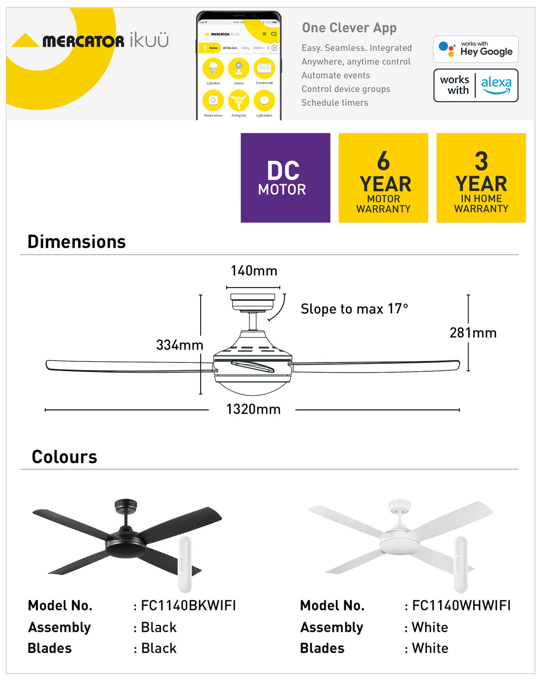MERCATOR ANOVA WHITE 132CM DC IKUU SMART WI-FI CEILING FAN WITH REMOTE FC1140WHWIFI