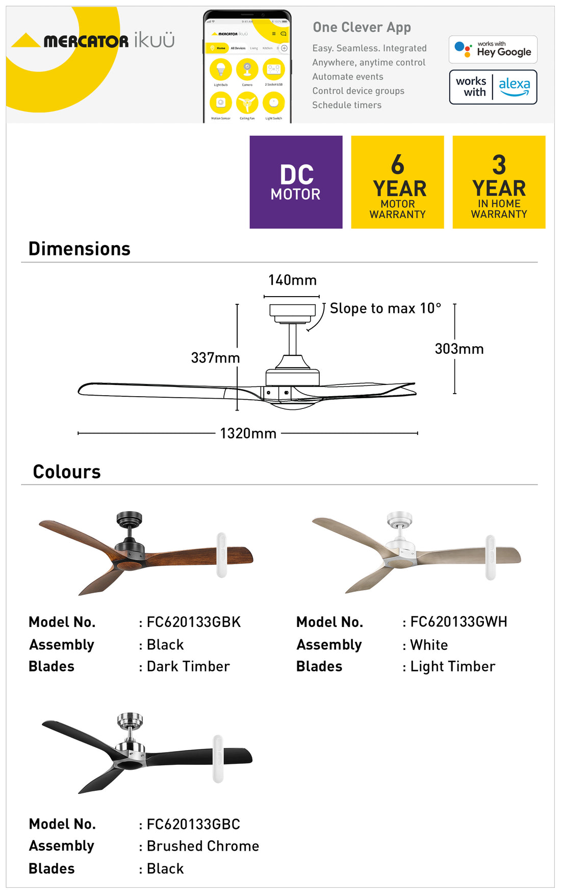 MERCATOR MINOTA BRUSHED CHROME 132CM DC IKUU SMART WI-FI CEILING FAN WITH REMOTE FC620133GBC